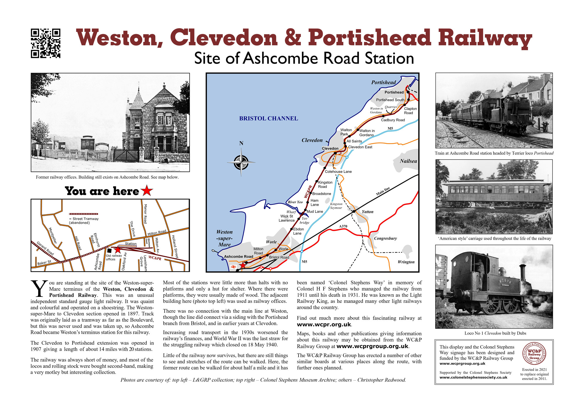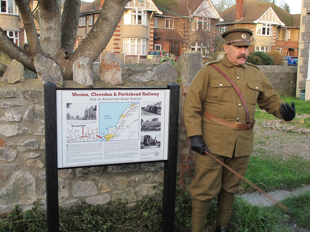 On 6 August 2021 we installed a new board at the Ashcombe Road station site to replace the original one which was deteriorating. The new board was funded entirely by the Group. The original, the first signage to commemorate the WC&PR, was unveiled by John Penrose, MP, on Friday 9 Dec 2011, watched by a crowd of about 25 consisting mostly of members, plus a Colonel Stephens ‘look-alike’, and a few dressed in period costume. In 2011, in addition to the interpretation board, permission was obtained from North Somerset Council to erect signage to mark the route of the railway in that vicinity by naming the footpath/lane which runs along the old track bed as ‘Colonel Stephens Way’ and two Colonel Stephens Way signs were installed at the same time. The WC&P Railway Group is grateful for a donation from the Colonel Stephens Society towards this signage. Remaining funding for the first sign was by the Group and members. We have also erected boards in Portishead, Clevedon, Ebdon Lane area, and Worle. In addition we have designed four boards, funded by North Somerset Council, which are installed along the new Greenway path at: Mud Lane, River Yeo (north), River Yeo (south), and Wick St Lawrence station site. Click photos to enlarge. |