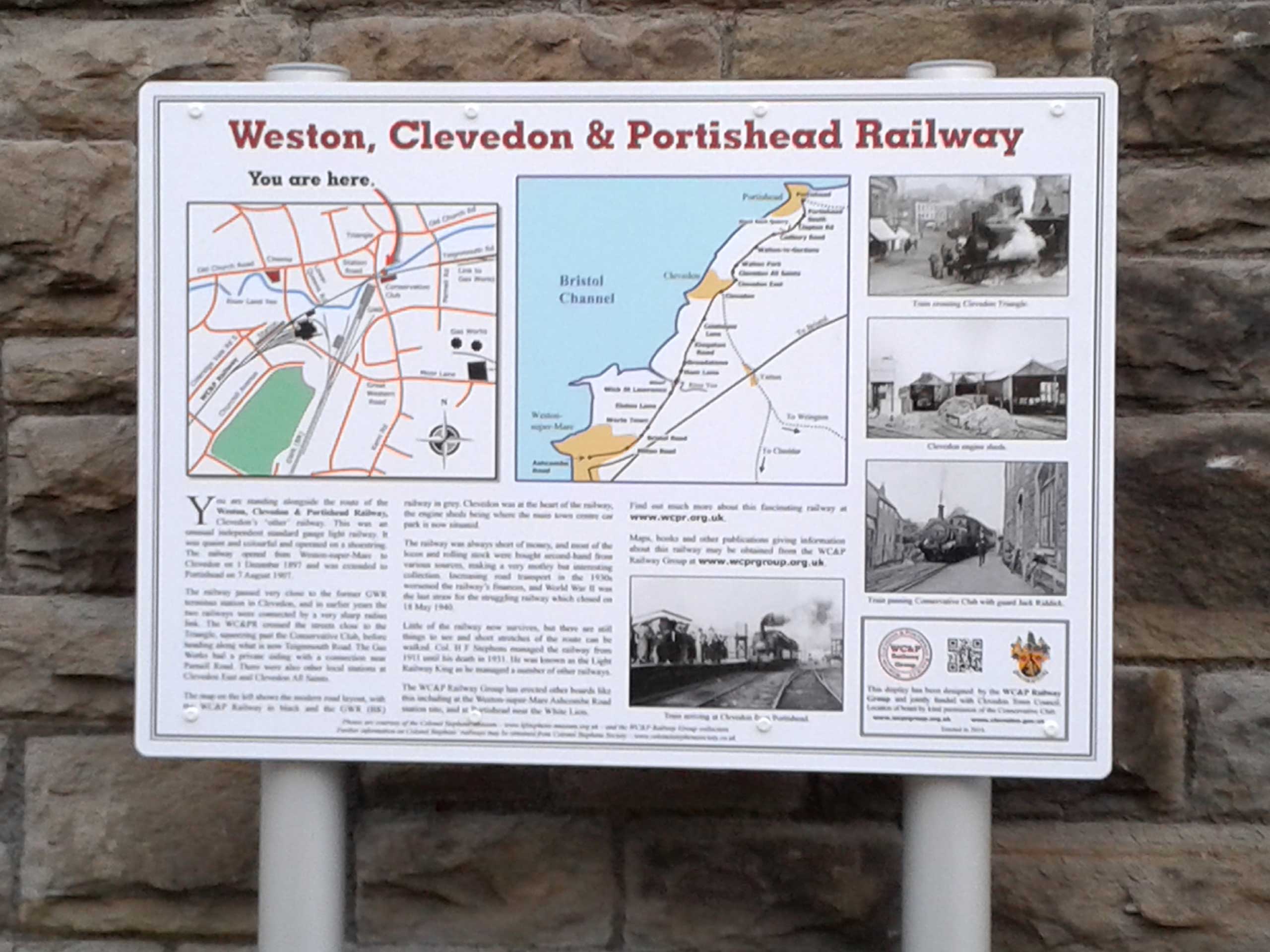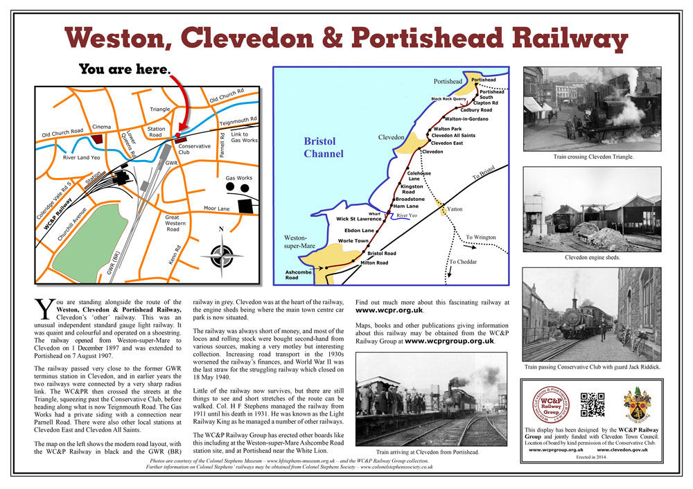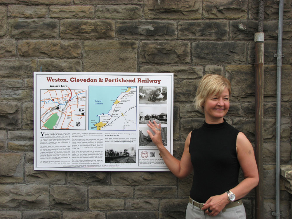 We installed our third Interpretation Board to commemorate the WC&PR, at Clevedon. On Weds 11 June 2014 the board was unveiled by Jemma Cooper, BBC local weather girl, watched by a crowd of supporters. This board was temporarily removed but in December 2014 was re-erected on legs, as the original wall fixings were insufficient. The WC&P Railway Group is grateful for funding from Clevedon Town Council towards this signage. We have also installed boards at Portishead, Ebdon Lane area, Worle and Weston-super-Mare. In addition we have designed four boards, funded by North Somerset Council, which are installed along the new Greenway path at: Mud Lane, River Yeo (north), River Yeo (south), and Wick St Lawrence station site. Click photos to enlarge. |